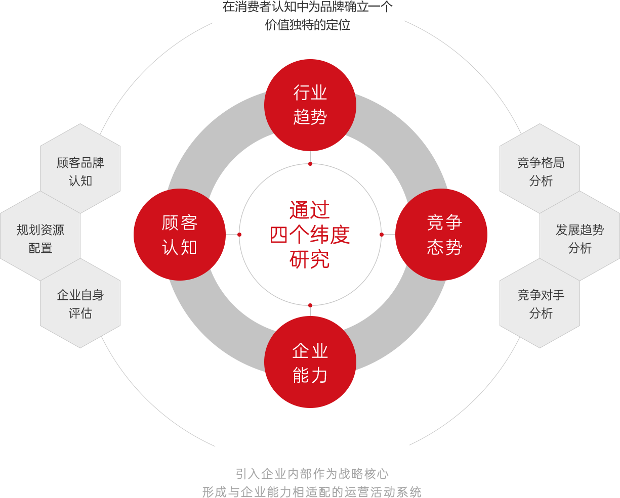 通過對“行業趨勢”、“競爭態勢”、“企業能力”和“顧客認知”四個維度研究,在消費者認知中為品牌確立一個價值獨特的定位,再引入企業內部作為戰略核心,形成與企業能力相適配的運營活動系統,成為企業經營成功的關鍵。